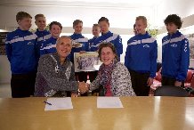 Vastlegging van een mooi moment: de ondertekening door Frits Lubout namens AJ Sports en Anneke van Zanen namens HV Hellas van een tweejarig sponsorcontract. En dat alles onder het toeziend oog van de heren C, onze kersverse Nederlands kampioenen.