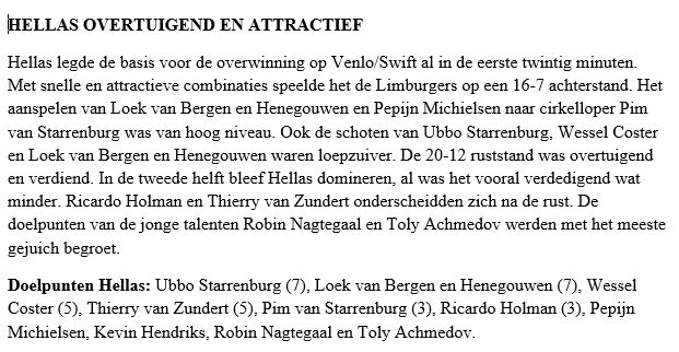 Het geeft maar weer eens aan, dat Hellas in korte tijd de degradatie-perikelen van de voorbije jaren van zich heeft afgeschud. Het plezier spat er vanaf in het veld. Het team van Voskuil wil in de degradatiepoule zelfs ‘best-of-the-rest’ worden na E&O en Swift die meestrijden om een plaats in de BENE-League. Zo spelend als tegen Venlo/Swift is dat ook niet ondenkbaar. Het zou een mooie kroon zijn op het jubileumjaar.