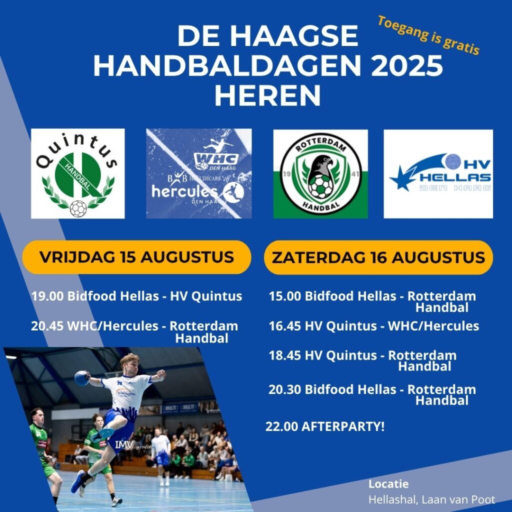 Hét handbalevenement van de regio is terug van weggeweest! Tijdens het weekend van 15 en 16 augustus barst het sportieve spektakel los met het Haagse Handbaltoernooi.Vier topteams – HV Quintus, Rotterdam Handbal, Bidfood Hellas en WHC/Hercules – nemen het tegen elkaar op