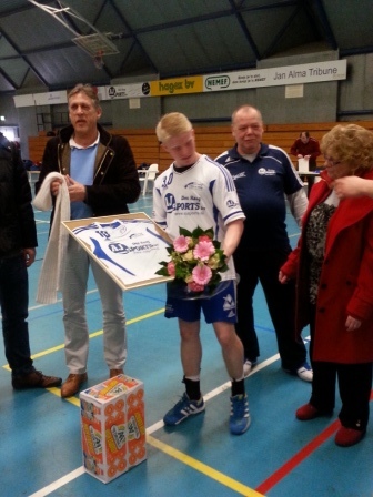 Afgelopen zondag na zijn laatste thuiswedstrijd in heren 2, werd Robin verrast door zijn teamgenoten en trainingsmaatjes. Zijn shirt dat voor de wedstrijd zoek was, kwam ingelijst te voorschijn en met bloemen, een doos AA-drink (i.p.v. de traditionele krat bier) en mooie woorden van trainer Nico nam de selectie afscheid van Robin. Maar niet helemaal: Robin gaat volgend jaar heren 4 versterken in de wedstrijden, maar blijft wel lekker meetrainen met de selectie.