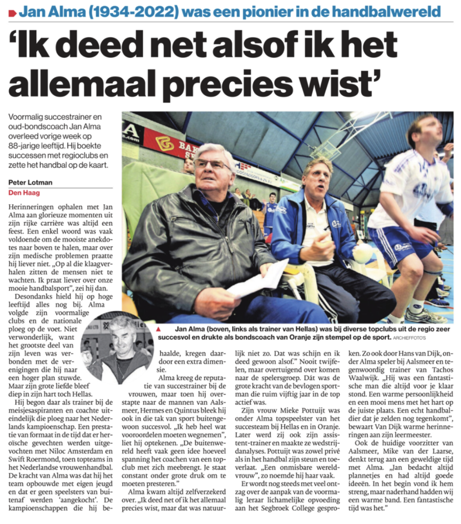 Er is in handbalwereld met verslagenheid gereageerd op het overlijden van succestrainer Jan Alma. De grijze eminentie onder de Nederlandse oefenmeesters overleed afgelopen weekeinde op 88-jarige leeftijd. Hij was een begrip vanwege zijn grote successen met Hellas, Aalsmeer, Hermes en Quintus. Landstitels, nationale bekers, Europa Cup, Oranje. Hij verdiende er vele prijzen en onderscheidingen mee.