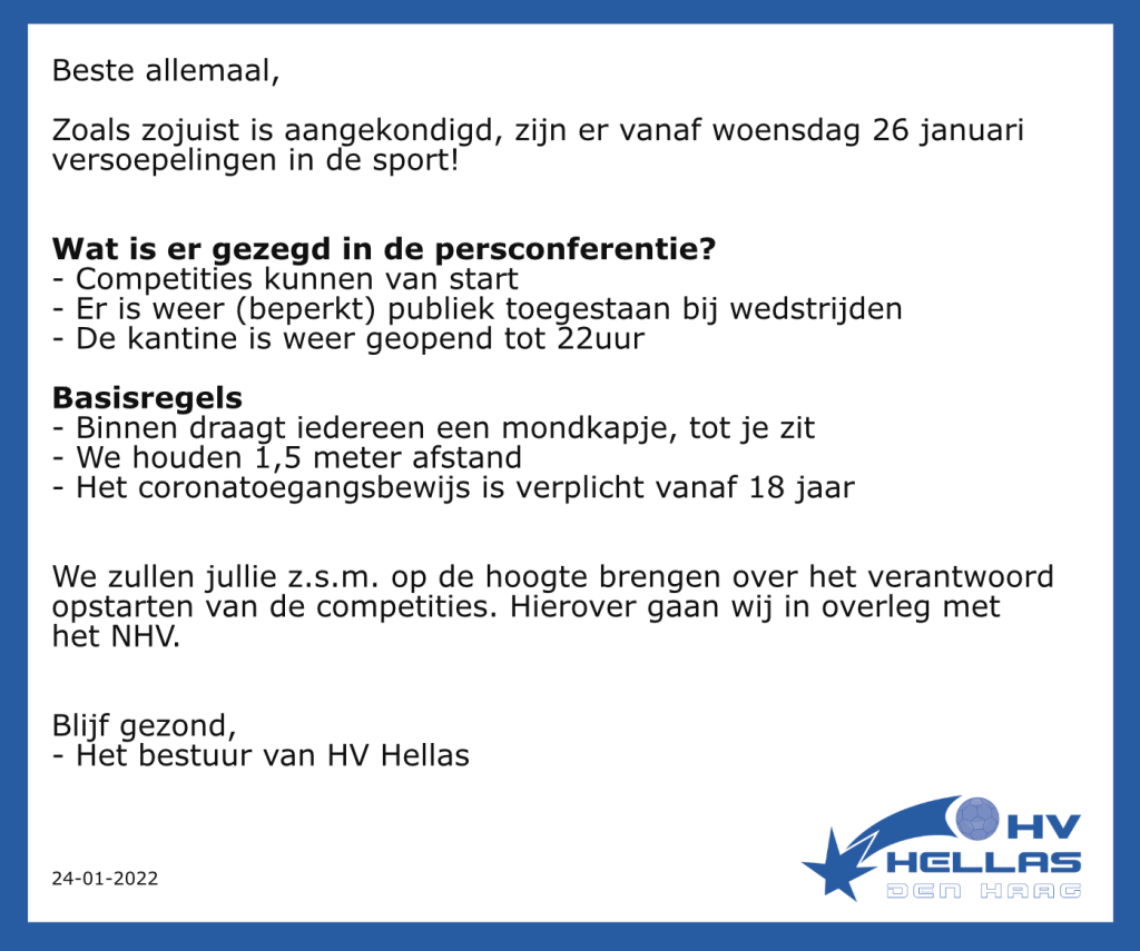 Zoals zojuist is aangekondigd, zijn er vanaf woensdag 26 januari versoepelingen in de sport!