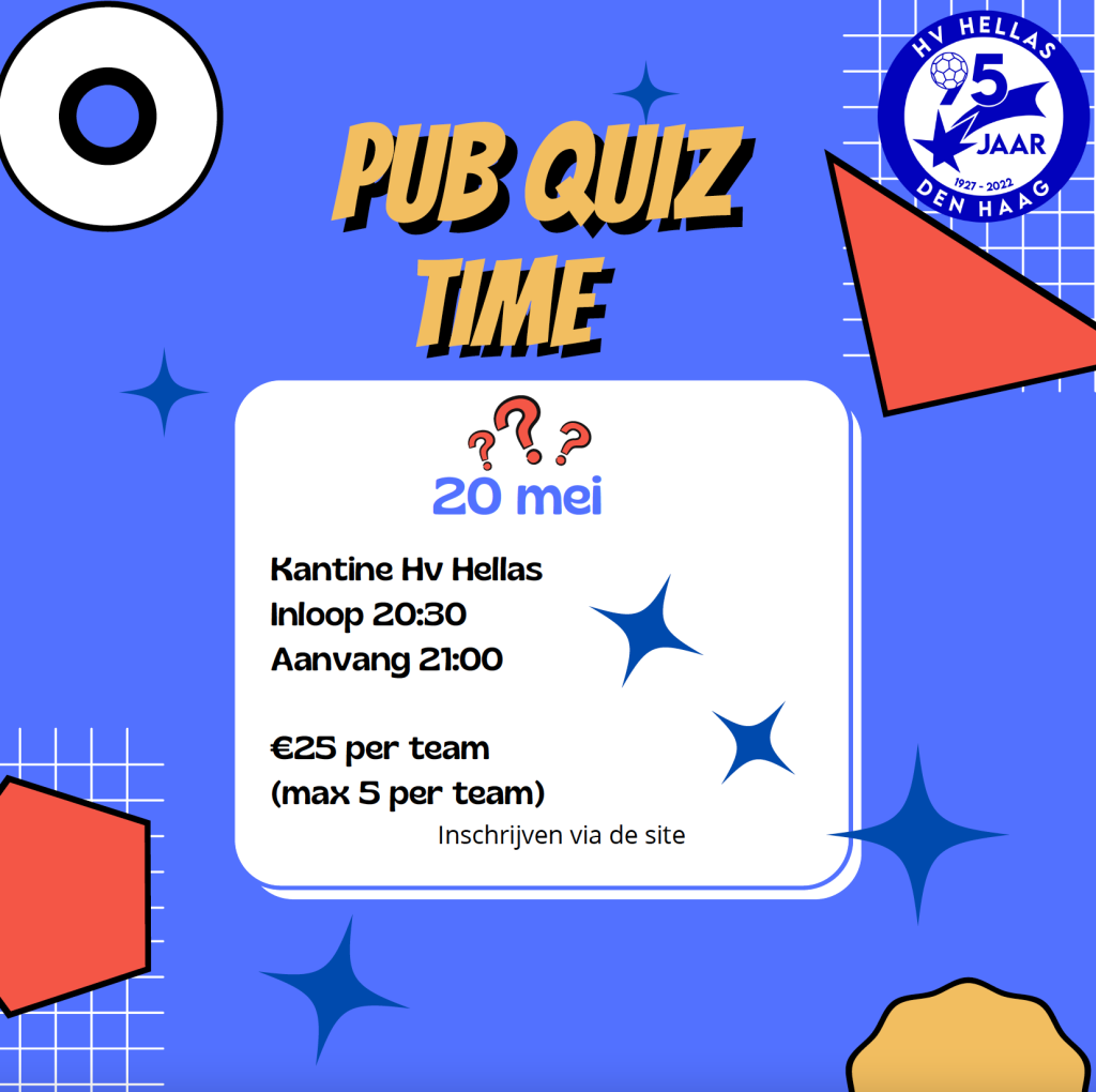 Verzamel je slimste familieleden en vrienden, want op vrijdag 20 mei om 20:30 uur is er weer HV Hellas pubquiz!