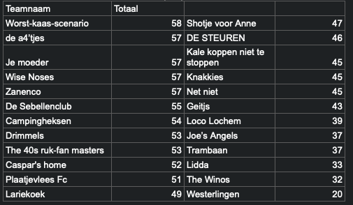 In het eerste weekend van mei was er weer een online pubquiz! We hopen dat het de laatste online pubquiz is en dat de volgende pubquiz weer als vanouds in de kantine kan zijn! De pubquiz, onder leiding van Jeroen Sebel, werd georganiseerd door de Eventscommissie. Het was ontzettend spannend en de tweede plek moest over 4 teams verdeeld worden. Er was één terechte winnaar: Worst-kaas-scenario. Gefeliciteerd!