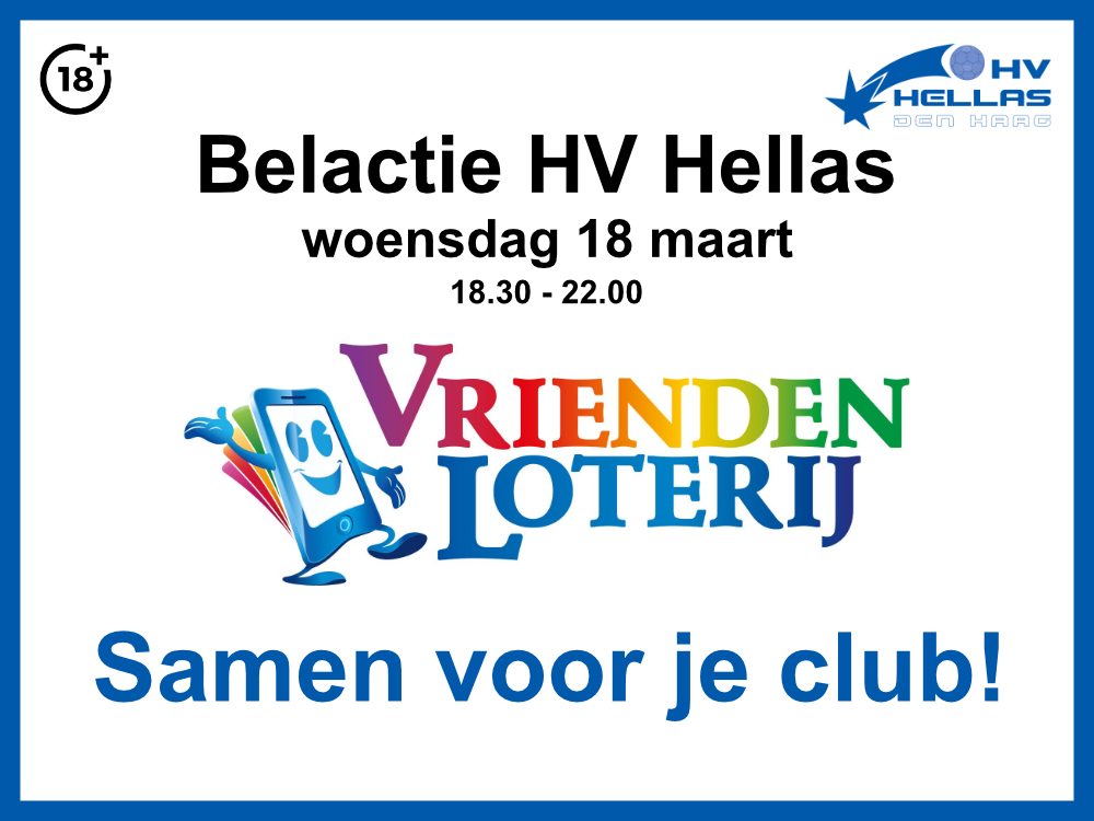 Op woensdag 18 maart houdt HV Hellas vanaf 18.30uur een belactie voor de VriendenLoterij.
