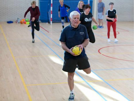 Onder leiding van 54-voudig international Léon van Schie zijn de 55+’ers iedere woensdagochtend van 9:30 tot 10:30 uur met elkaar aan het handballen bij Health & Sports Club Westduin, aan het begin van het Sportpark aan de Laan van Poot